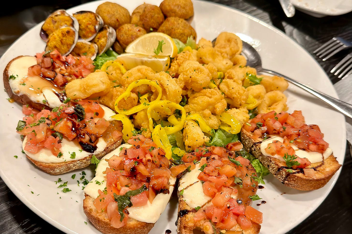 As mentioned above, we began our evening at Cassarino’s where we were welcomed by our two Providence Tour Company hosts and led upstairs for our first course, which of course was a platter of antipasti. All the dishes at our stops were served family style, except for dessert, and there was enough food for everyone in the party to enjoy. We were in a group of ten, Brenda and I, and two groups of four that we met that evening for the first time, which made for a lot of new conversations.